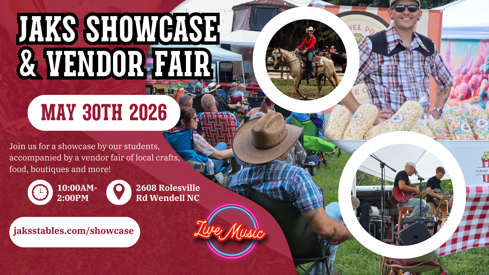 Come out to watch our riders showcase their talents in the arena! Then peruse our vendors, enjoy some live music, and eat some delicious food. Admission is FREE for spectators/shoppers; vendor applications start March 1st.